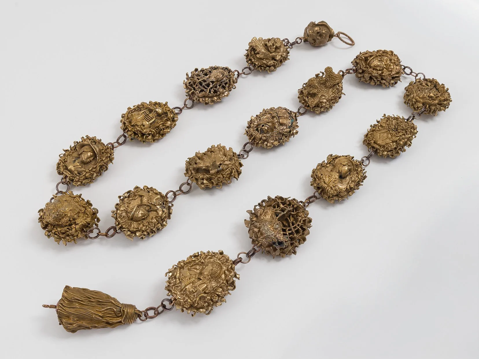 Around each portrait and a sculpted skeletal bust, I modeled an undulating border of leaves, vines, and fruits. Although these intertwined forms emulated the gilded silverwork in the memento mori, it was the natural environs of my family’s home in Hawai`i that I saw preserved in these shapes. Taking in a wider view of the Pacific and of time itself, I sculpted a plaque of Amborella flowers at all stages of bloom. The oldest living ancestor of Earth’s flowering plants, Amborella trichopoda exists in the wild only on the main island of New Caledonia in Melanesia. Its sex determination is plastic and not fixed: an individual plant can change sex between flowering seasons. Following its lead, I switched the gender of the bifurcated terminal pendants, exchanging the decomposing men for a woman with a half bob and a sectional cut through her floppy hat. I sculpted a curvaceous and jumbo-sized tassel to stand in for her body as the second terminal.