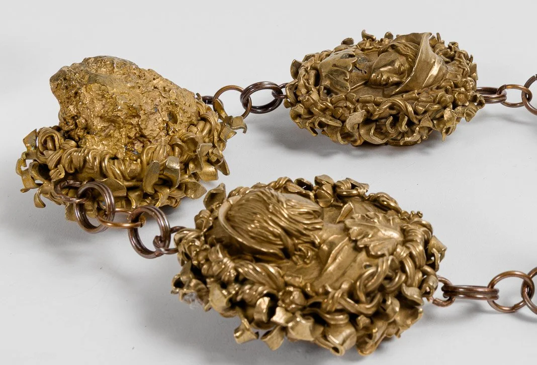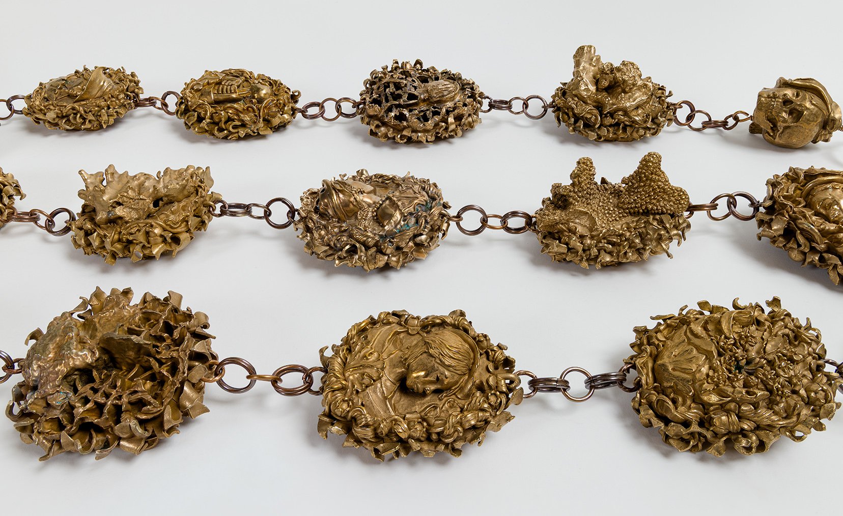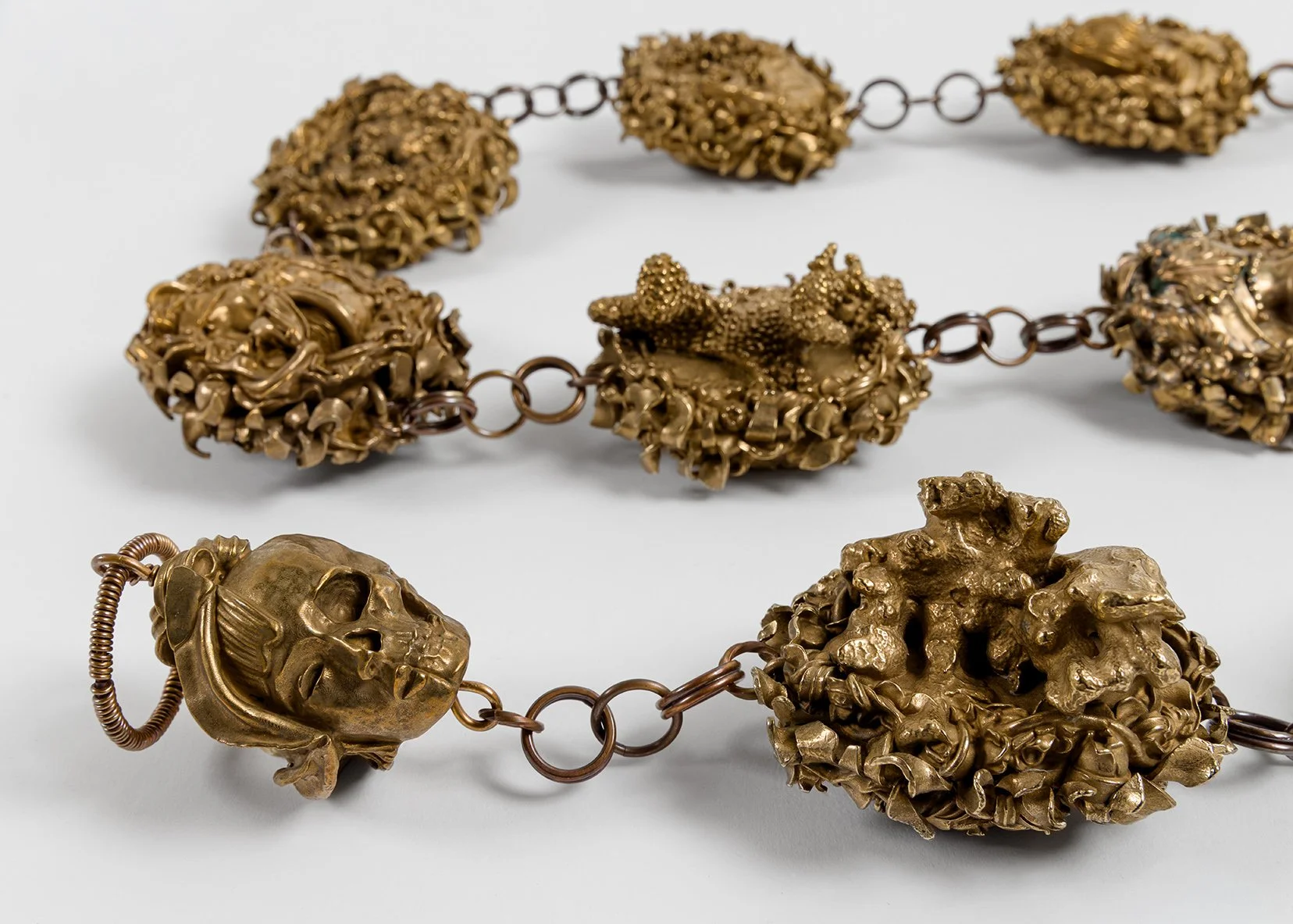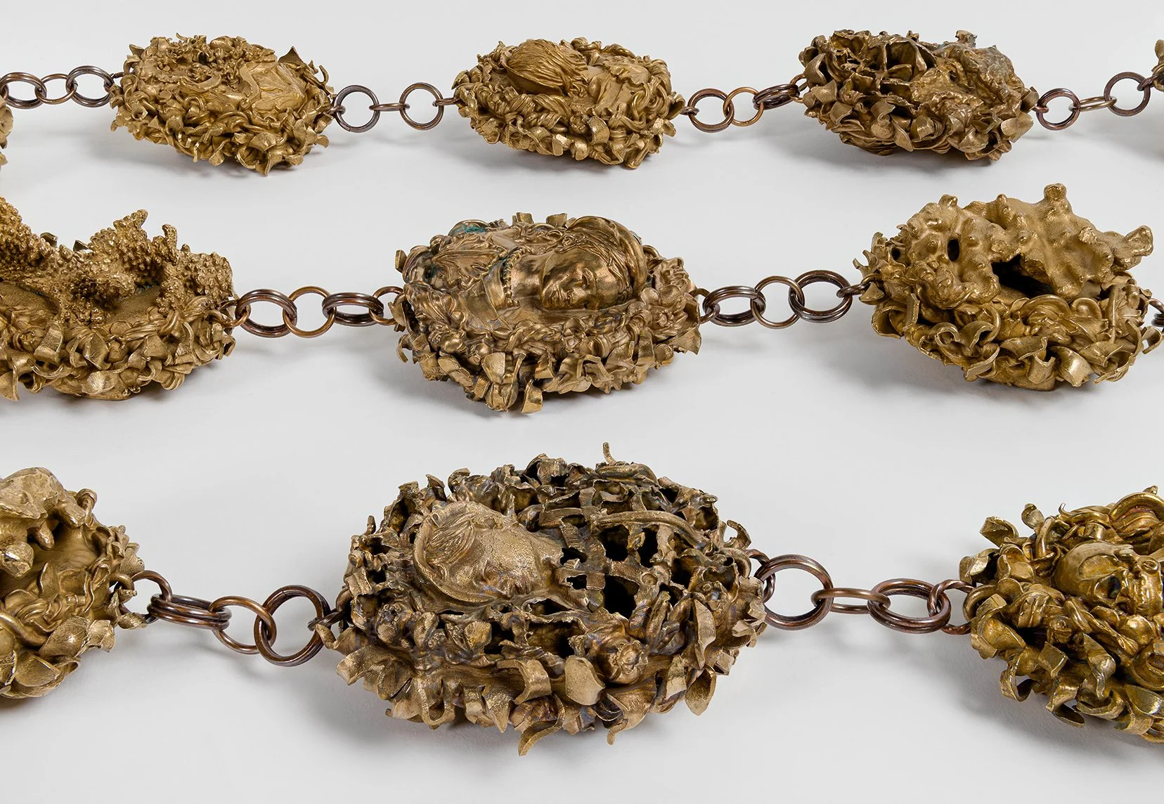 Bridging ancient and contemporary techniques, my sculptures were 3D scanned and digitally paired, each with a different obverse and reverse. Additionally, I scanned pieces of coral rubble – the skeletal remnants of ancient corals that my mother unearthed while digging in our backyard – and digitally combined these with three sculptures. Fifteen pairs – each with a unique up-facing side – were scaled to a four-inch length, with a thin, starburst shape digitally inserted and sandwiched between the sides. The terminals were also scanned and scaled down. The files were 3D printed in wax and cast in bronze, and I preserved imperfections in the casting process to suggest transformation, change, and time. A metalsmith hammered the starburst into an undulating sharp-pointed fringe to consolidate front and back of each pair, and then joined the pieces with handmade links. Comprising seventeen solid bronzes, the chain spanned five feet and weighed 35 pounds. It had transformed into something other.